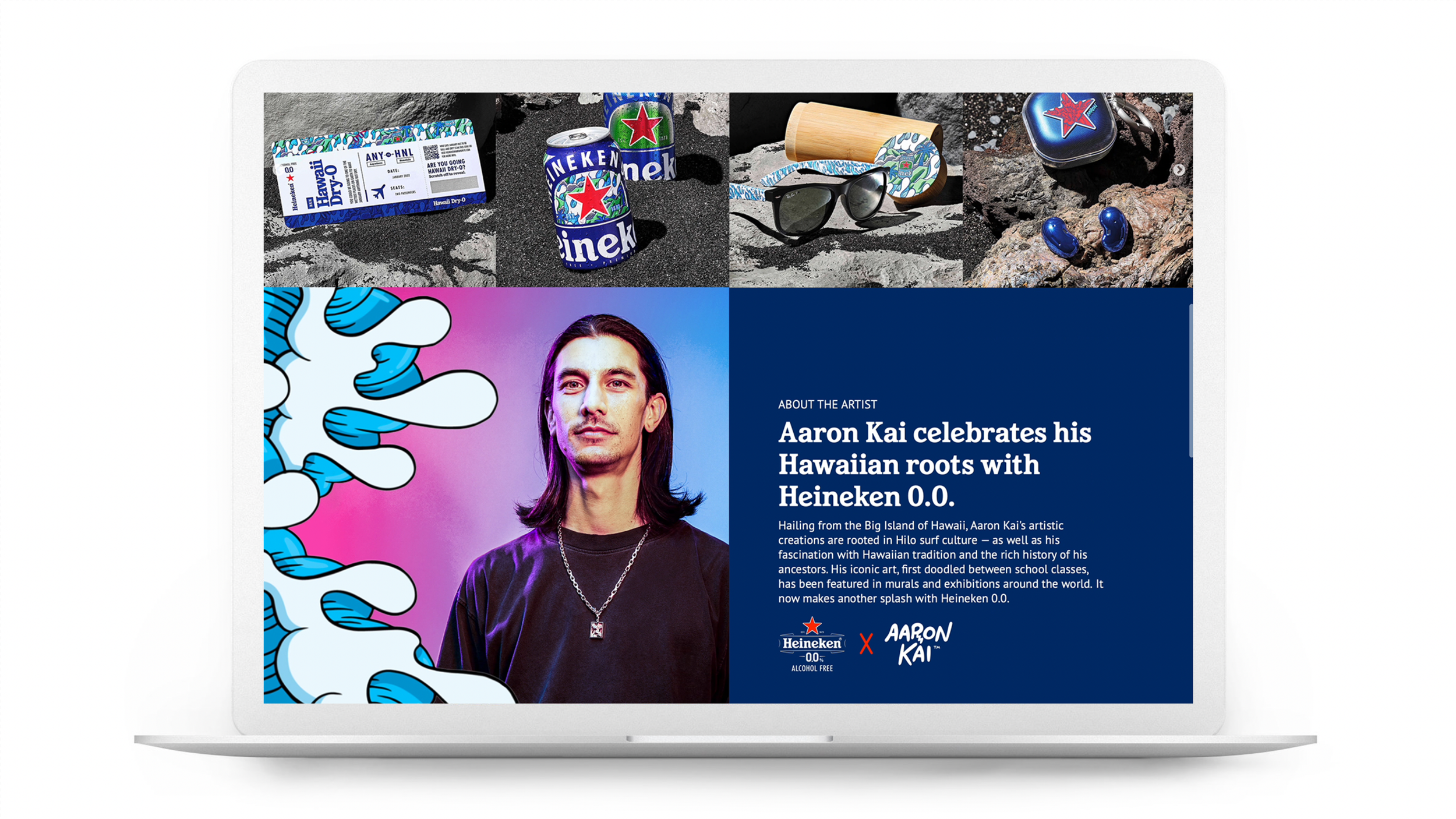 We created 500+ limited edition packs with Hawaiian-born artist Aaron Kai, who’s art captured the wavy feels of the waters that surround the islands, as well as the hearts of many streetwear and street culture fans around the world. Each kit included a six pack of Heineken 0.0 (three of them with limited edition Kai art), a pair of hydro-dipped Ray-Bans, custom noise-cancelling earbuds, a towel displaying Aaron's mural work, and a ticket- which had a scratch off area with the chance at a trip for two to finish their dry month out in wet and sunny Hawaii.